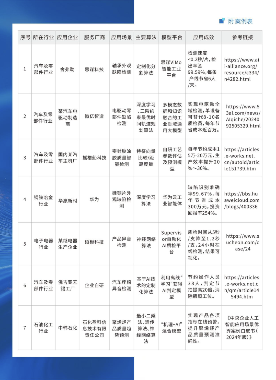 本次报告综合了7个应用案例的具体方案和实施过程,总结提炼了AI质量检测的通用性实施步骤,包括需求分析与场景定义、数据采集与预处理、技术方案选择与模型训练、硬件与系统集成部署、测试验证与迭代优化、规模化推广与持续改进,为企业部署方案提供参考。
