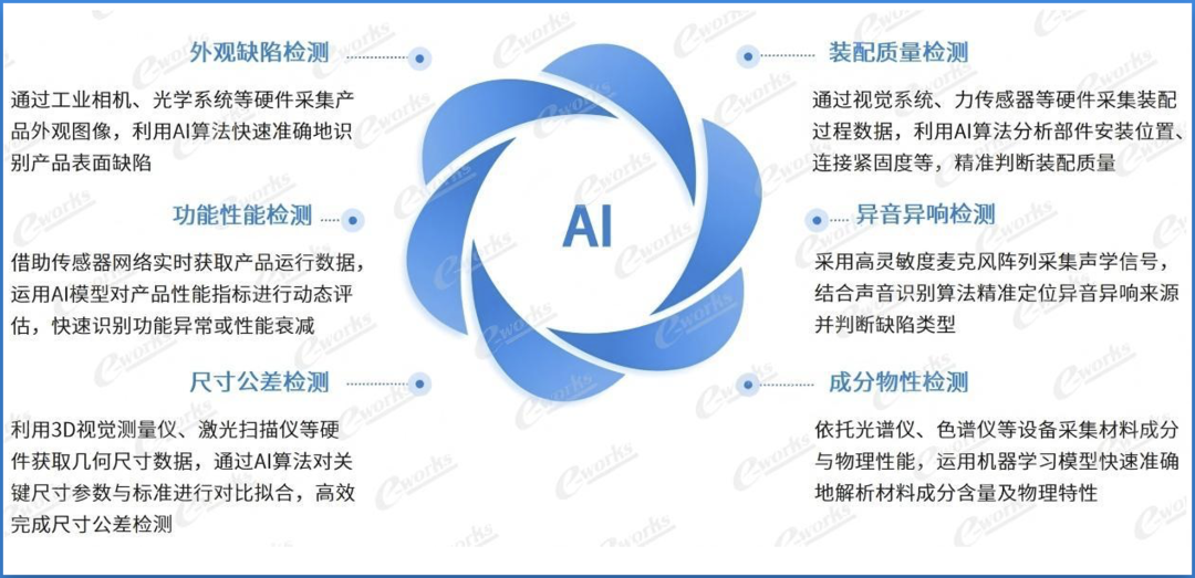 本次报告基于检测的缺陷类别差异,将AI质检划分为外观缺陷检测、功能性能检测、尺寸公差检测、装配质量检测、异音异响检测、成分物性检测六大细分应用场景,并对各细分场景进行解析。