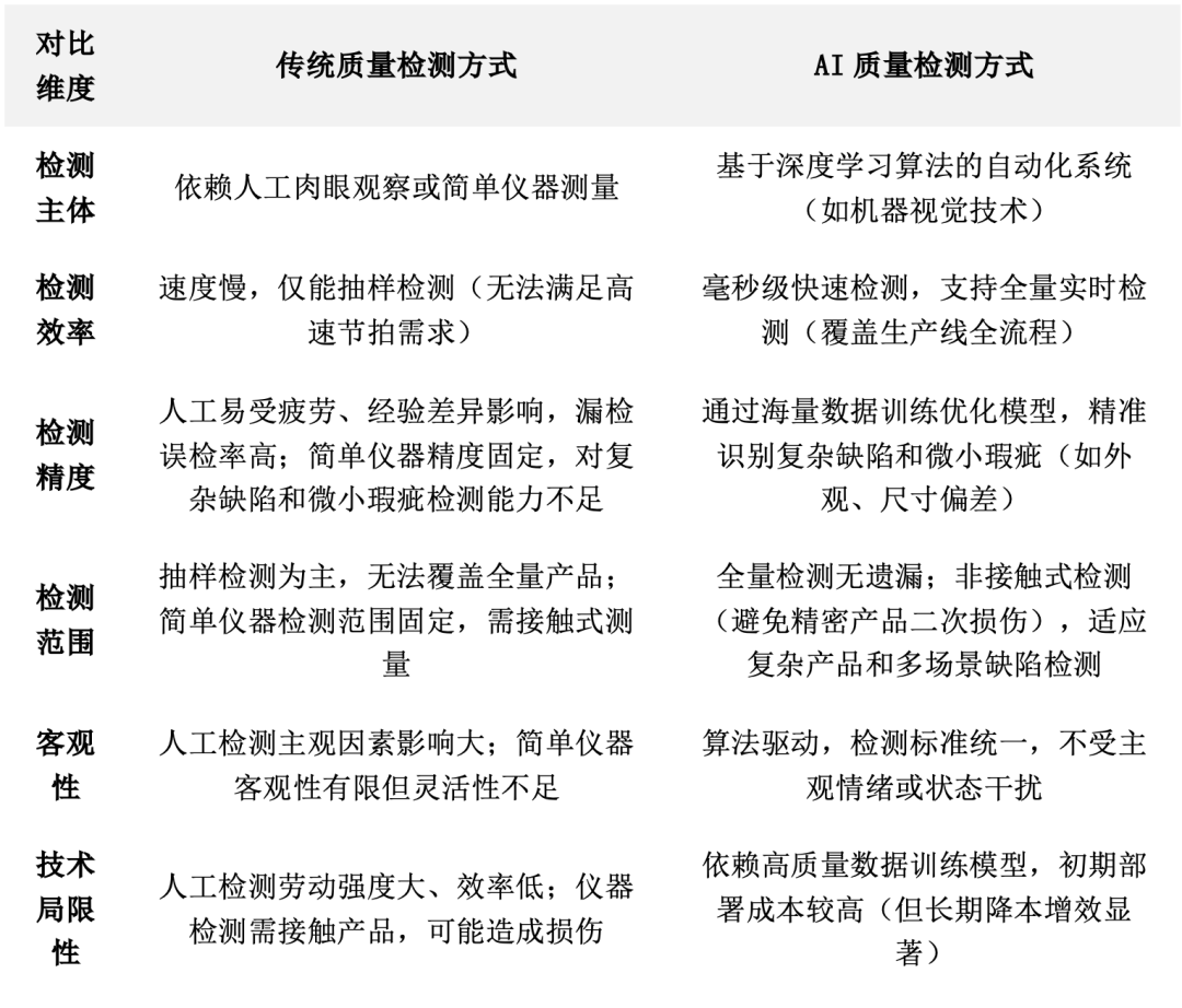 综上所述,本次报告揭示了AI技术对于制造业质量检测环节的革命性重塑。针对传统质检普遍存在的效率瓶颈、精度局限及人工依赖痛点,AI利用深度学习、机器视觉、声振融合等技术,构建起覆盖外观缺陷检测、功能性能验证、尺寸公差管控等六大场景的智能化解决方案体系,结合七个实际案例证明了AI质检在缺陷识别准确率提升、检测周期压缩、全流程追溯能力强化等方面的显著价值。此外,本次报告还提炼出涵盖需求诊断、数据治理、模型选型到部署验证的通用性实施路径,为企业构建AI质检能力提供可复用的方法论。未来,随着AI与边缘计算、数字孪生等技术的协同演进,制造业质检将实现从单点智能化检测到全链路质量预判的升级,推动制造企业质量管控能力的全面升级。